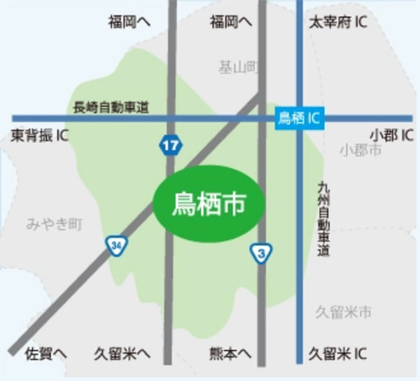 - 福岡方面より国道3号線、または県道17号線にて鳥栖方面へ