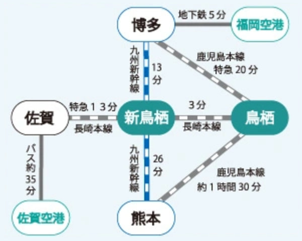 熊本駅より新幹線にて26分、新鳥栖駅下車。鳥栖駅へは在来線で3分